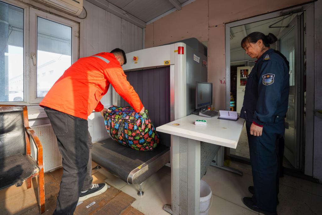 1月31日、新疆ウイグル自治区ウルムチ市にある中鉄特貨物流ウルムチ分公司の三坪物流基地で、車両内の荷物の保安検査を行う係員。(ウルムチ=新華社記者/徐宏岩)