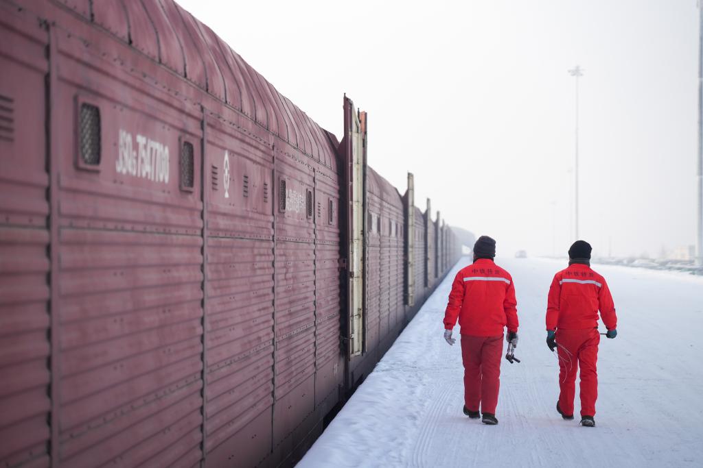 1月31日、新疆ウイグル自治区ウルムチ市にある中鉄特貨物流ウルムチ分公司の三坪物流基地で、列車のホームを巡回する係員。(ウルムチ=新華社記者/徐宏岩)