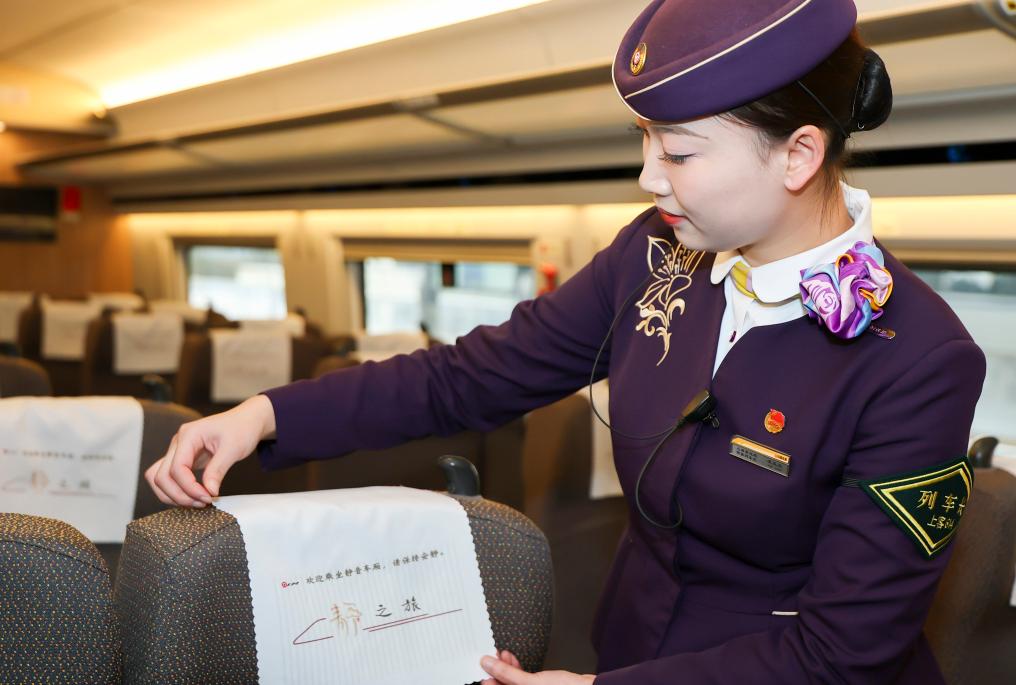 1日、G12号列車でサイレント車両の表示を整える車掌。(上海=新華社記者/王翔)