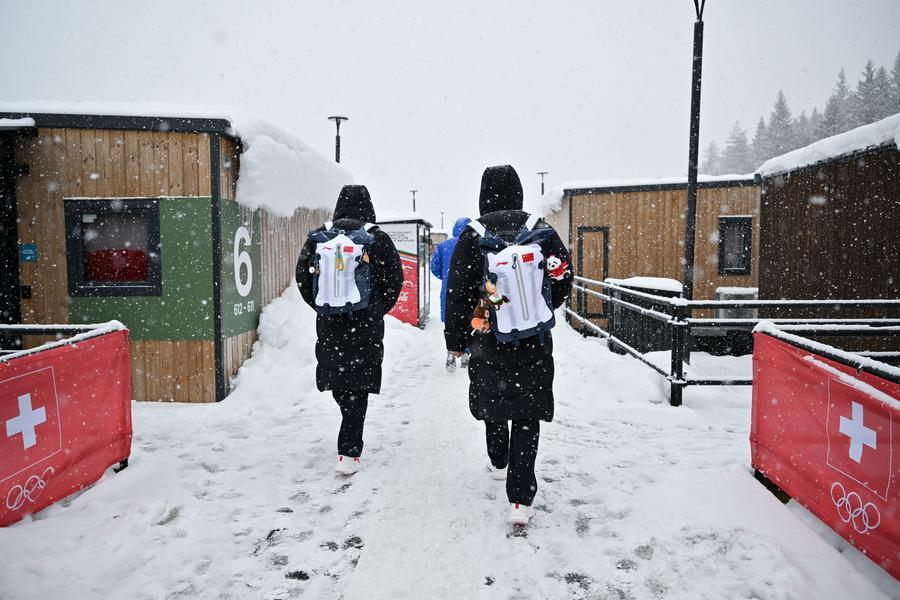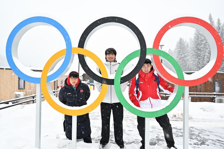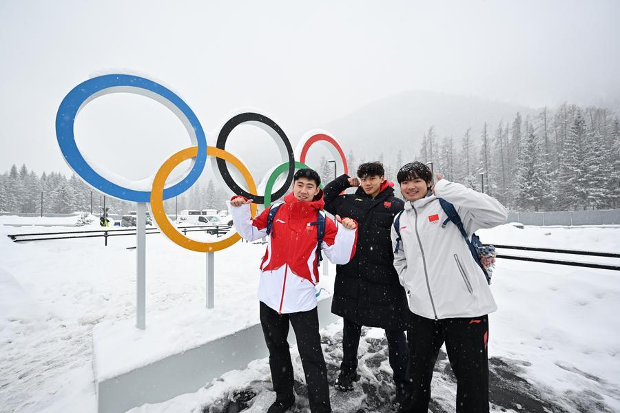 3日、コルティナダンペッツォの選手村を歩く中国代表メンバー。(コルティナダンペッツォ=新華社記者/連漪)