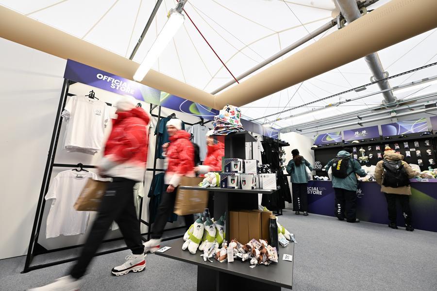 3日、コルティナダンペッツォ選手村の売店で買い物をする人たち。(コルティナダンペッツォ=新華社記者/連漪)
