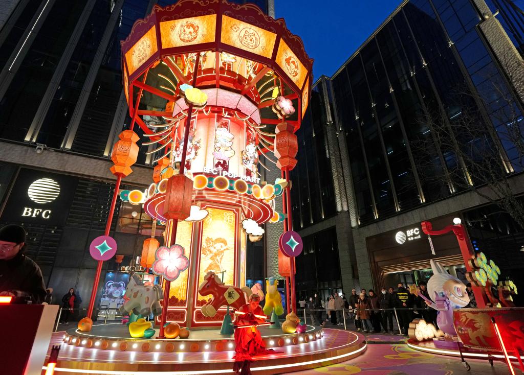 1日、上海のBFC外灘金融センター前で点灯された回転木馬型の装置。(上海=新華社記者/劉穎)