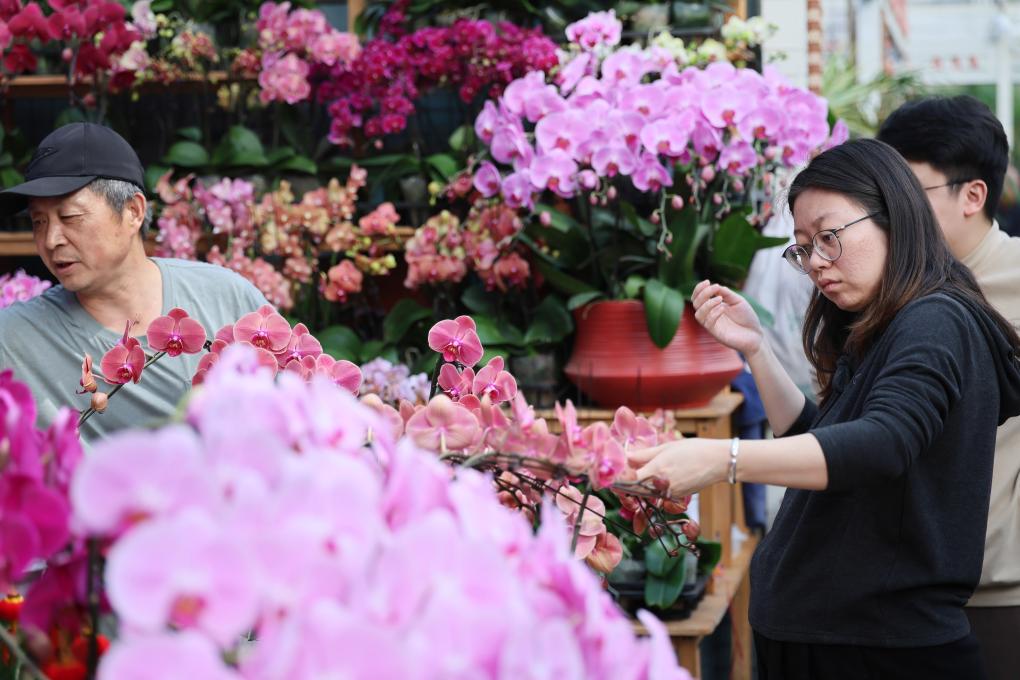 1日、曹荘花卉市場で花を選ぶ客。(天津=新華社記者/李然)
