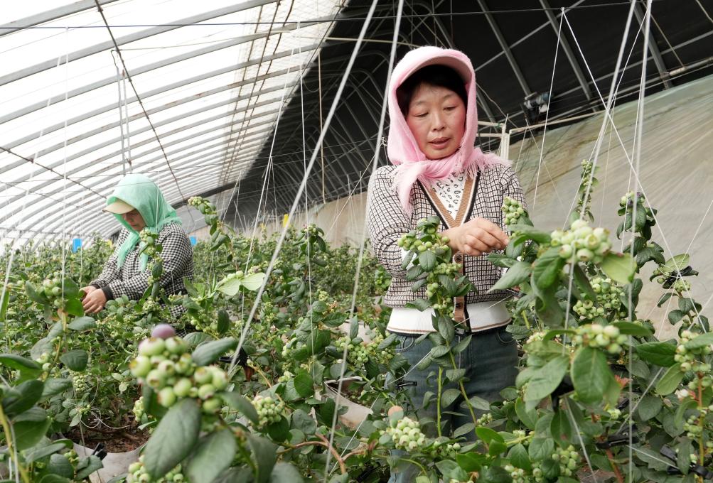 1日、ハウス内でブルーベリーの手入れをする盧竜県のブルーベリー栽培合作社の組合員。(秦皇島=新華社記者/楊世尭)