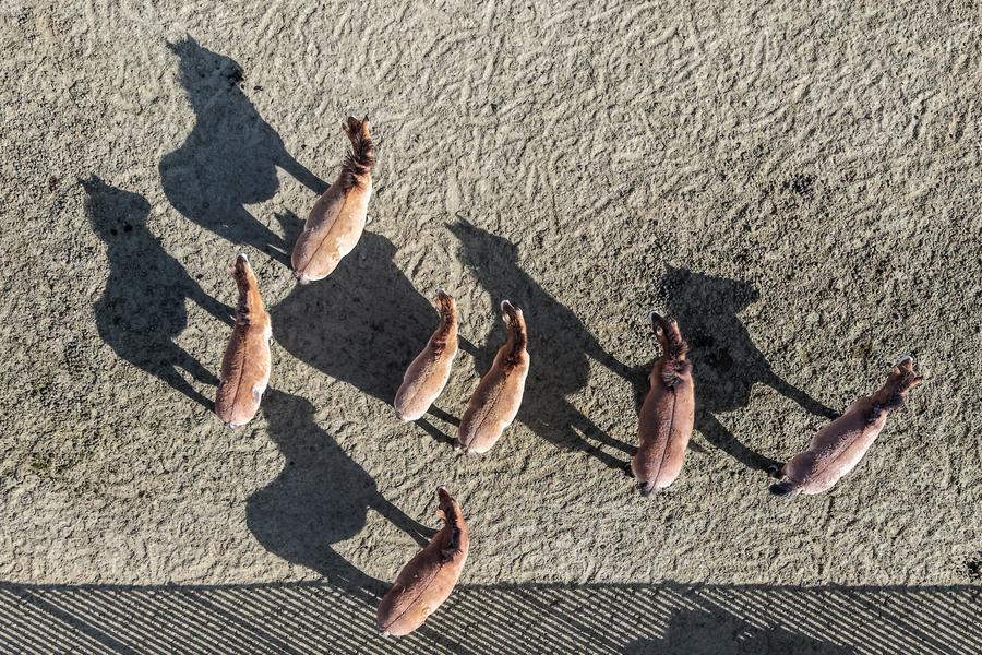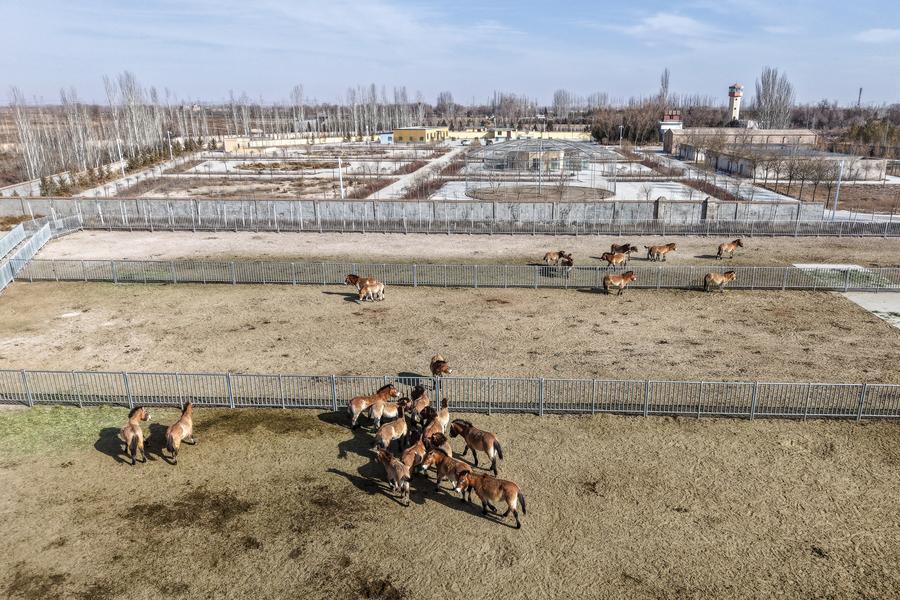 3日、甘粛絶滅危惧動物保護センターで飼育されているモウコノウマ。(ドローンから、武威=新華社記者/郎兵兵)