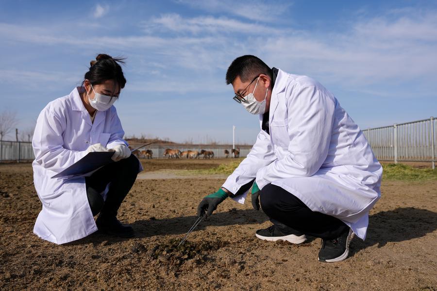 3日、甘粛絶滅危惧動物保護センターで、モウコノウマのふんを観察する職員。(武威=新華社記者/郎兵兵)
