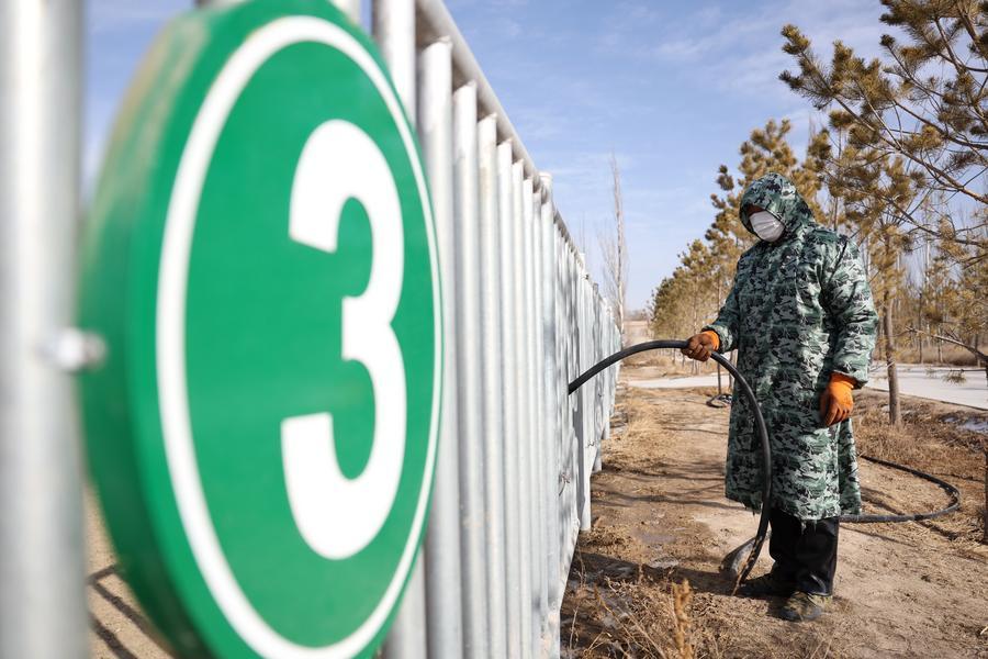 3日、甘粛絶滅危惧動物保護センターで、柵の外からモウコノウマの飲み水を補充する職員。(武威=新華社記者/陳斌)