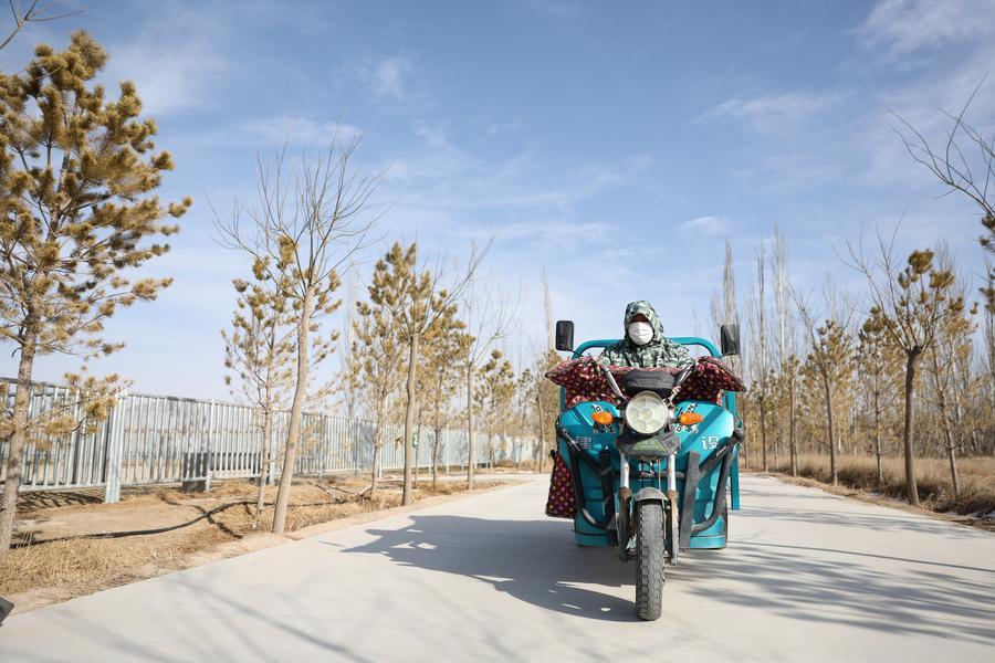 3日、三輪バイクでモウコノウマの飼料を運ぶ甘粛絶滅危惧動物保護センターの職員。(武威=新華社記者/陳斌)