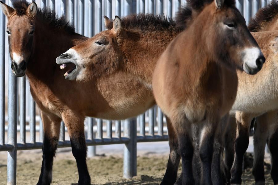 3日、甘粛絶滅危惧動物保護センターで飼育されているモウコノウマ。(武威=新華社記者/陳斌)