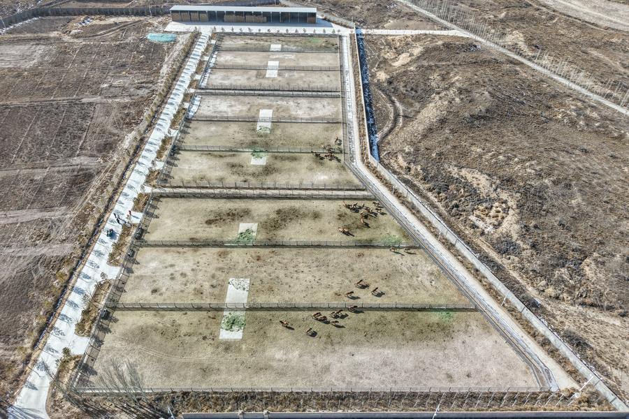 3日、甘粛絶滅危惧動物保護センターのモウコノウマが飼育拠点。(ドローンから、武威=新華社記者/郎兵兵)