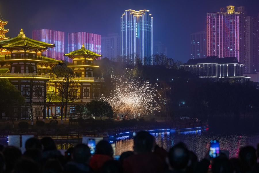 5日、春節用品文化フェアの開幕式でパフォーマンスを鑑賞する来場者。(重慶=新華社記者/陳誠)