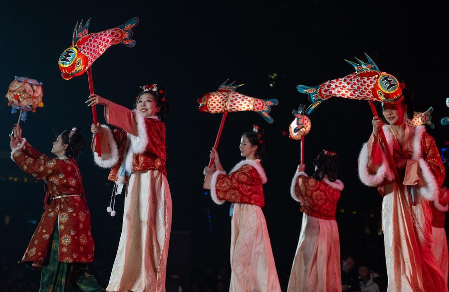 5日、春節用品文化フェアの開幕式でパフォーマンスを披露する出演者。(重慶=新華社記者/陳誠)