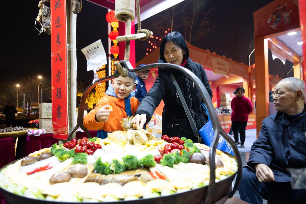 5日、湖北新春国際消費シーズンのイベント会場で郷土料理を見る人。(武漢=新華社記者/肖芸九)