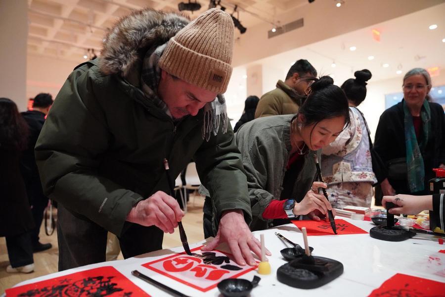 8日、「中国の味」春節文化イベントで、書道を体験する人たち。(ニューヨーク=新華社記者/張鳳国)