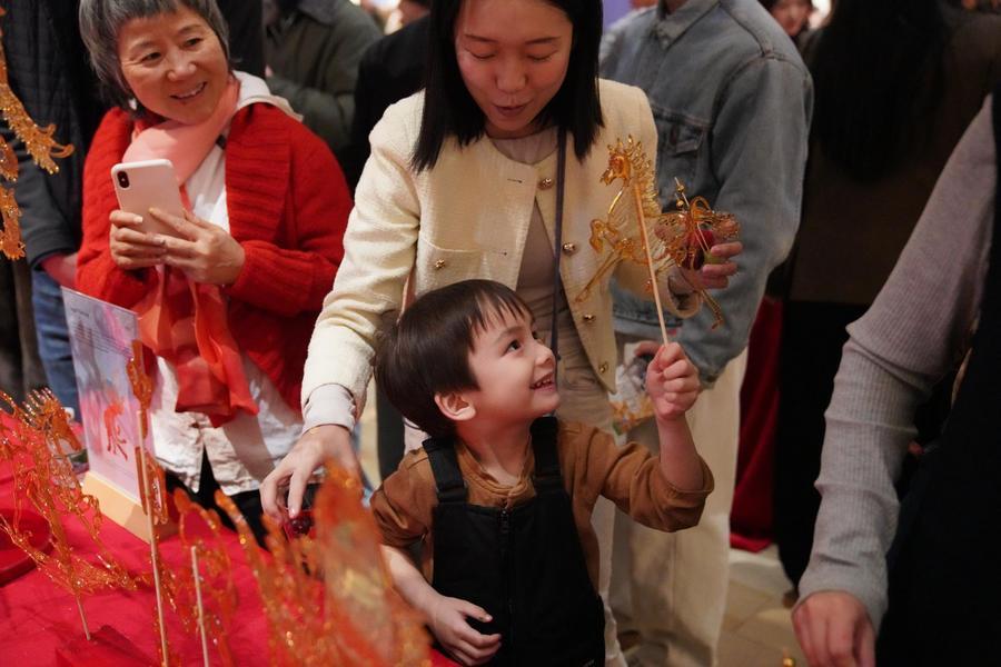 8日、「中国の味」春節文化イベントで、飴細工を受け取る子ども。(ニューヨーク=新華社記者/張鳳国)