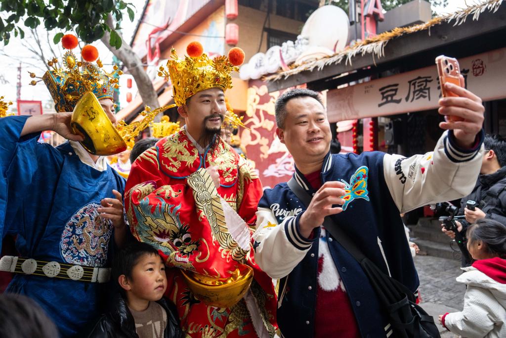7日、寧郷市炭河古城風景区で財神に扮(ふん)した出演者と記念撮影する観光客。(長沙=新華社記者/陳思汗)