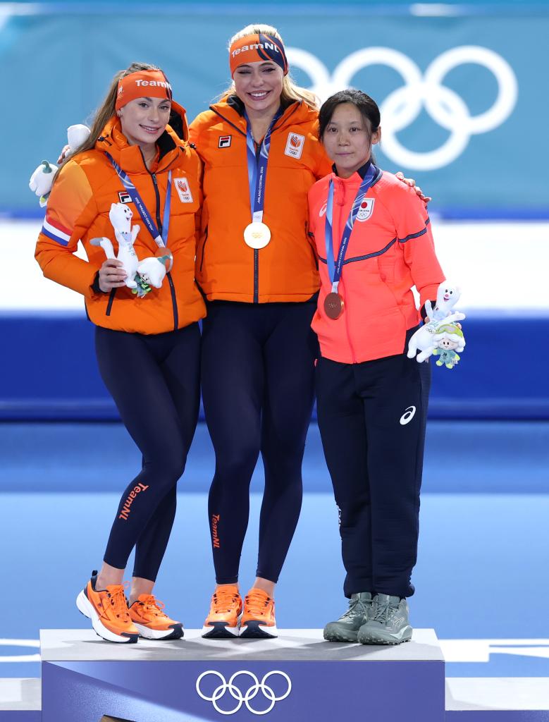 9日、表彰式に臨む(左から)銀メダルのフェムケ・コク、金メダルのユタ・レールダム、銅メダルの高木美帆。(ミラノ=新華社記者/武巍)