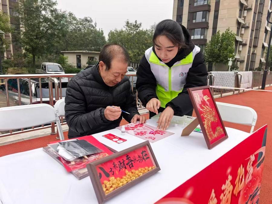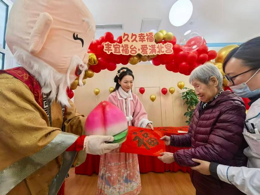 北京市豊台区北宮鎮の高齢者介護サービスセンターで、高齢者にパフォーマンスを披露し、「福」の字を手渡すボランティア。(2025年10月24日撮影、北京=新華社記者/夏子麟)