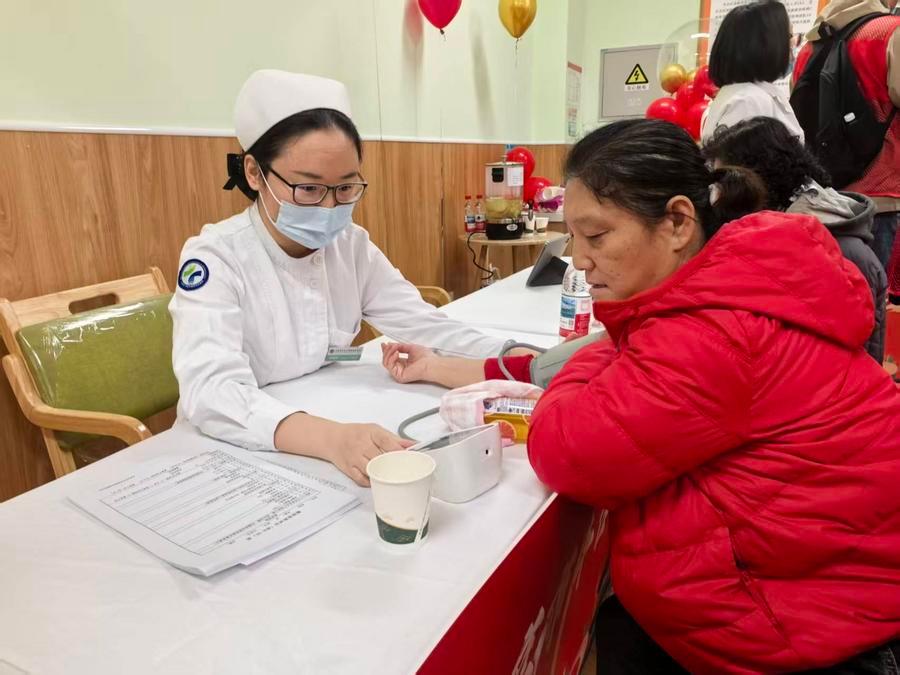 北京市豊台区北宮鎮の高齢者介護サービスセンターで、高齢者の血圧を測定する医療スタッフ。(2025年10月24日撮影、北京=新華社記者/夏子麟)
