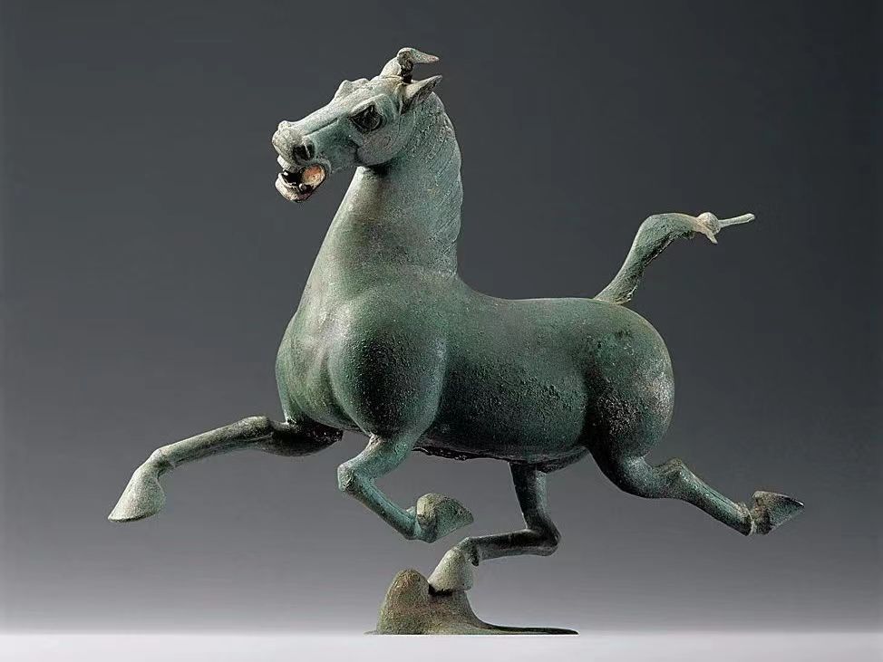 銅奔馬は1960年代に同省武威市の雷台漢墓から出土した後漢時代の青銅器。高さ34・5センチ、長さ44・5センチ、中国観光のシンボルマークとして知られる。駿馬が3本の脚を宙に躍らせ、残る1本で猛禽を踏む姿に造形され、速さと力強さみなぎる一瞬を生き生きと表現している。