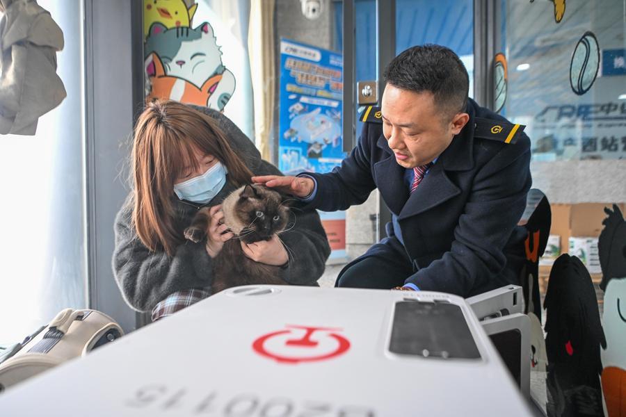 9日、ペットを専用ケージに入れる鉄道職員と利用客。(重慶=新華社記者/唐奕)