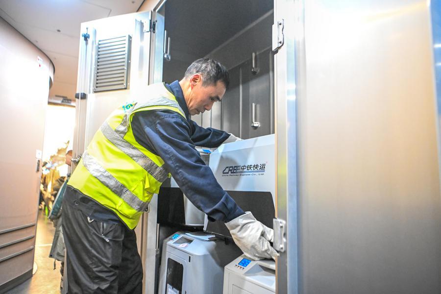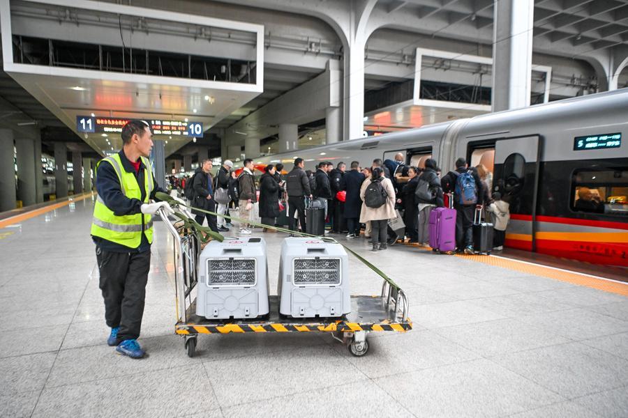 9日、重慶西駅のホームでペットの入ったケージを列車に積み込むのを待つ鉄道職員。(重慶=新華社記者/唐奕)