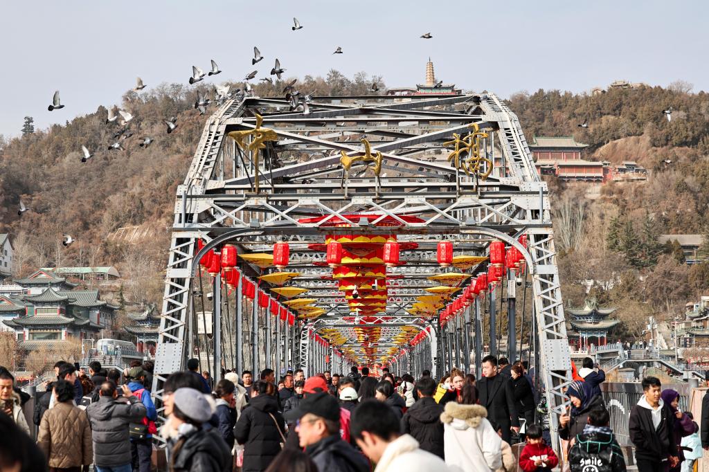 9日、蘭州市の中山橋を散策する人々。(蘭州=新華社配信/侯崇慧)