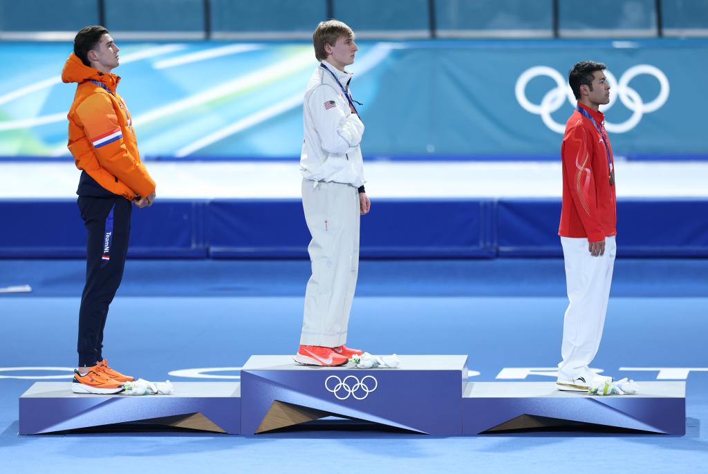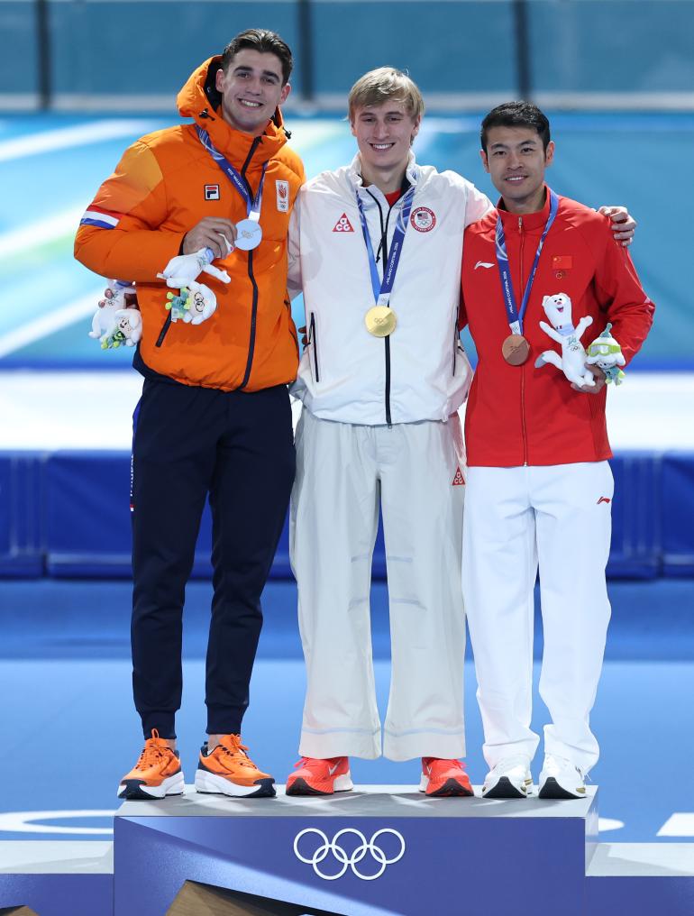11日、表彰式に臨む(左から)銀メダルのイエンニング・デボー(オランダ)、金メダルのジョーダン・ストルツ(米国)、銅メダルの寧忠岩。(ミラノ=新華社記者/李京)