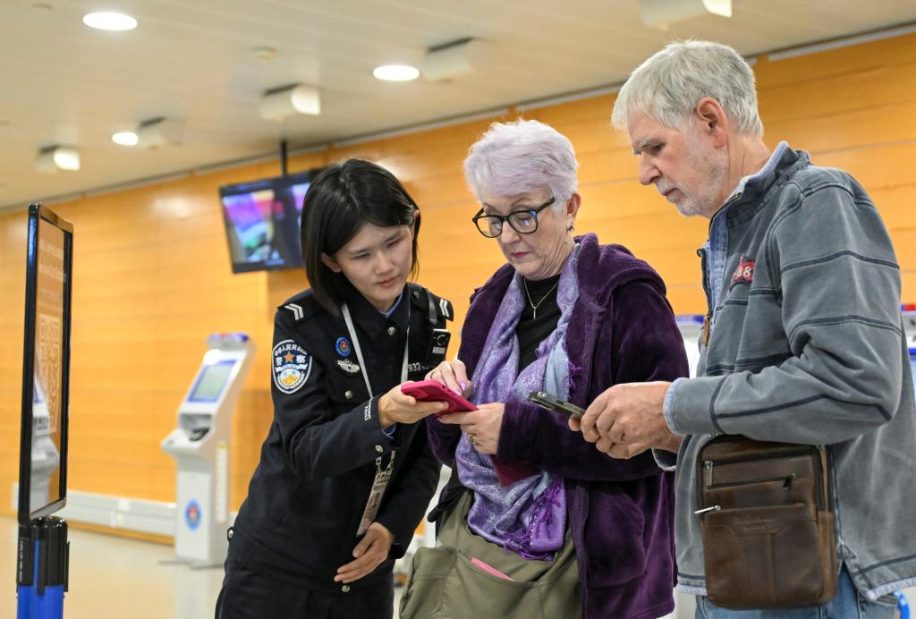 11日、上海浦東国際空港口岸で、外国人旅行者の入国カード記入を手伝う警察官。(上海=新華社記者/陳浩明)