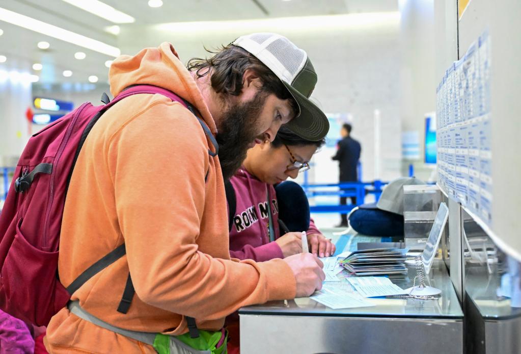 11日、上海浦東国際空港口岸で、入国カードを記入する外国人旅行者。(上海=新華社記者/陳浩明)
