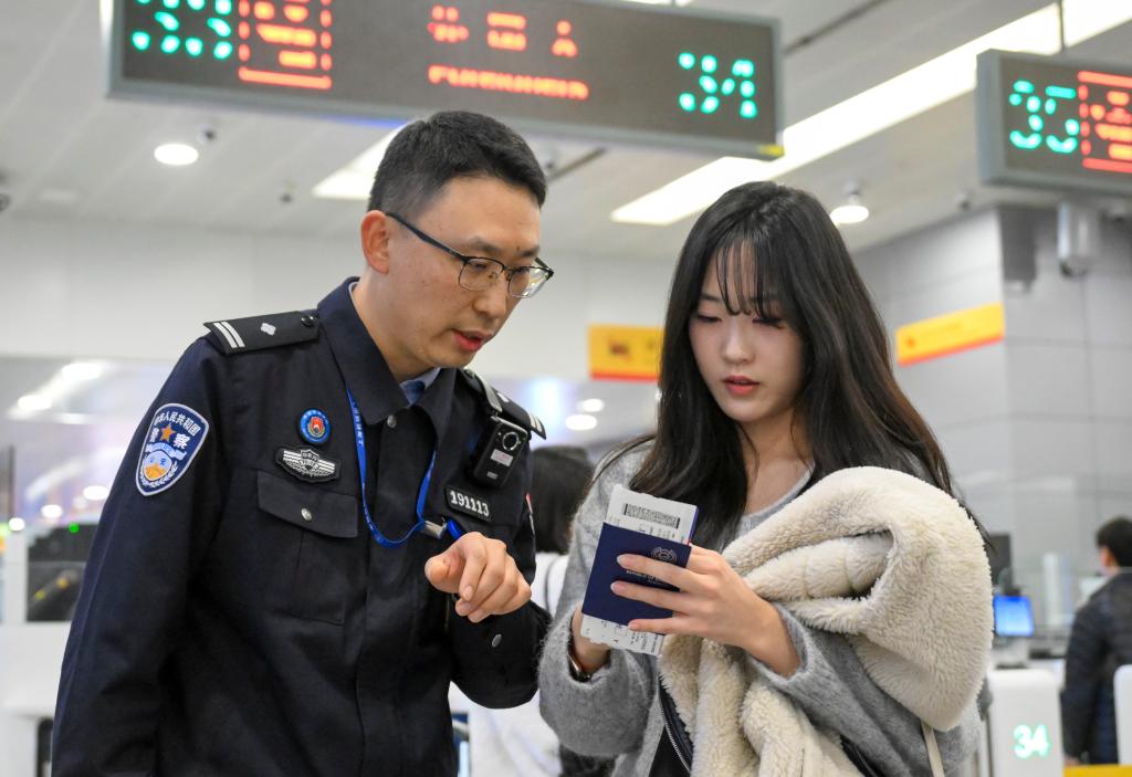 11日、上海浦東国際空港口岸で、韓国人旅行者の入国カード記入を手伝う警察官。(上海=新華社記者/陳浩明)