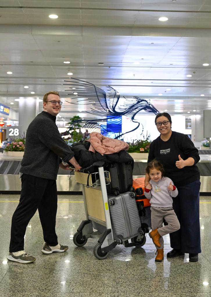 11日、上海浦東国際空港の手荷物受取所でポーズを取る米国から訪れた一家。(上海=新華社記者/陳浩明)