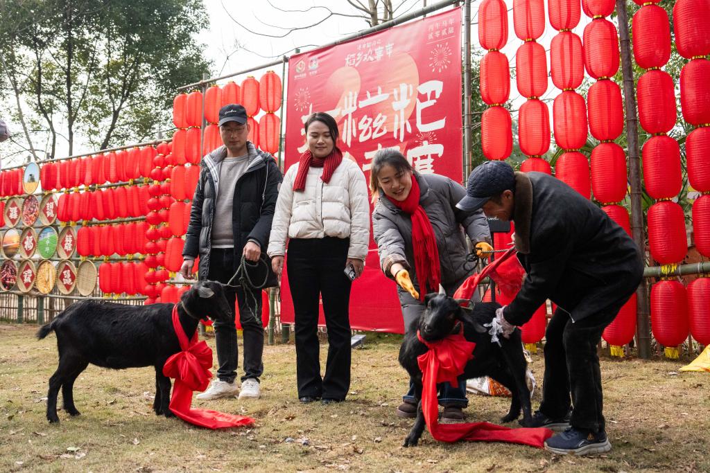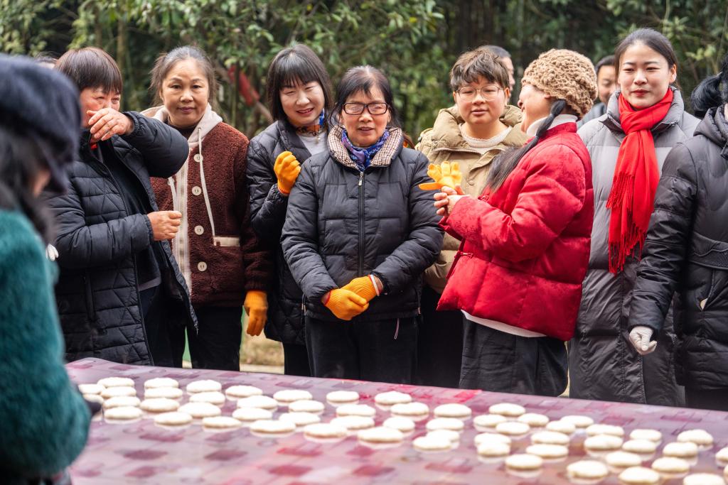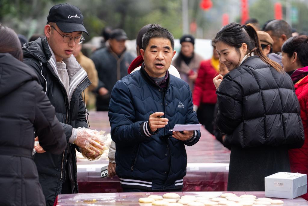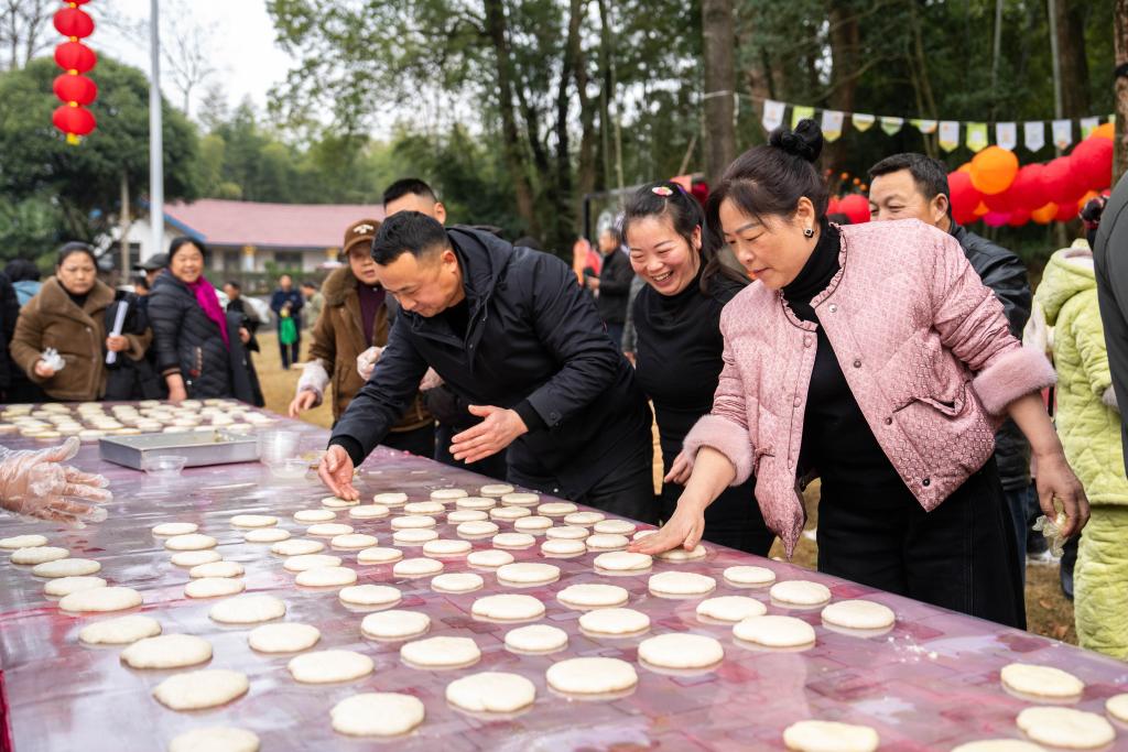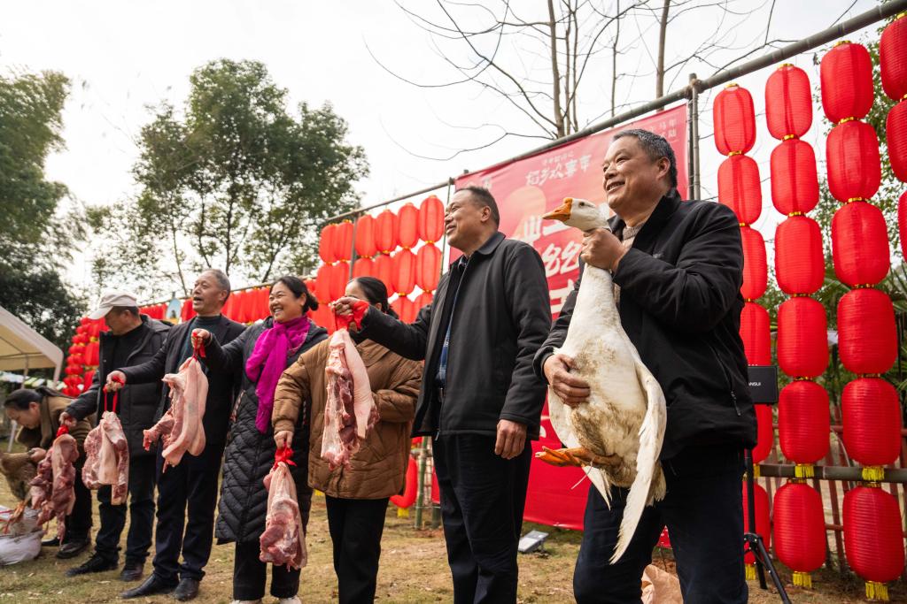 10日、常徳市の港中坪村で糍粑作り大会の賞品を受け取る住民ら。(長沙=新華社記者/陳思汗)