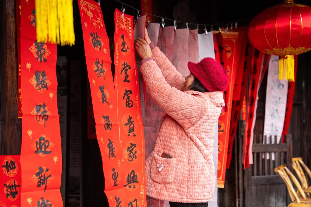 10日、常徳市の港中坪村で春聯を選ぶ住民。(長沙=新華社記者/陳思汗)
