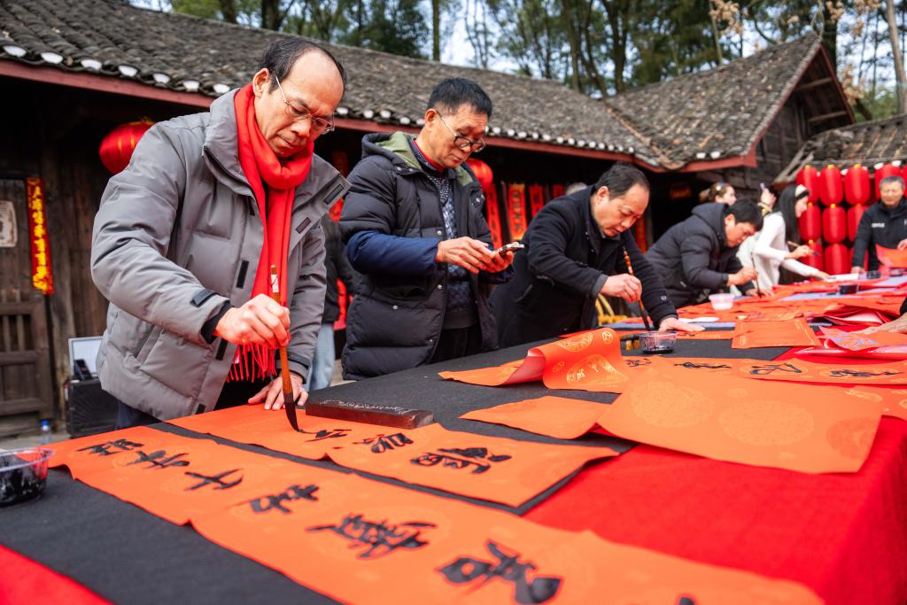 10日、常徳市の港中坪村で春聯を書く住民ら。(長沙=新華社記者/陳思汗)