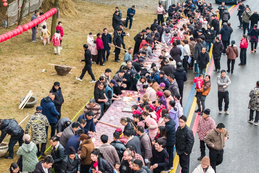 10日、常徳市の港中坪村で糍粑作り大会に参加した住民ら。(ドローンから、長沙=新華社記者/陳思汗)