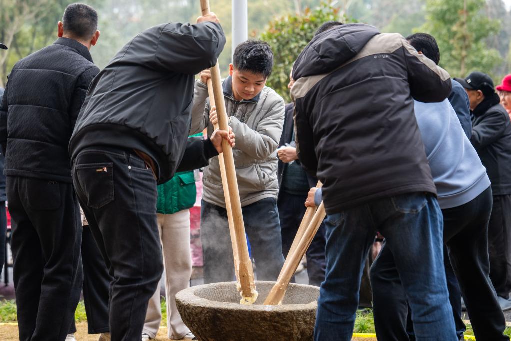 【新華社長沙2月13日】春節(旧正月、今年は17日)が近づく中、中国湖南省常徳市の港中坪村で迎春イベントが開かれた。住民らは餅菓子「糍粑(ツーバ)」作りで腕を競い、縁起の良い対句「春聯(しゅんれん)」をしたため、めでたい絵柄の版画「年画」を刷るなど、伝統習俗を通して新年の訪れを祝っていた。
