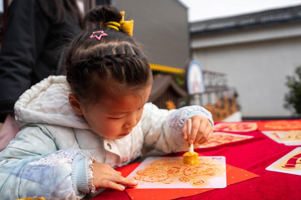 10日、常徳市の港中坪村で年画を刷る子ども。(長沙=新華社記者/陳思汗)