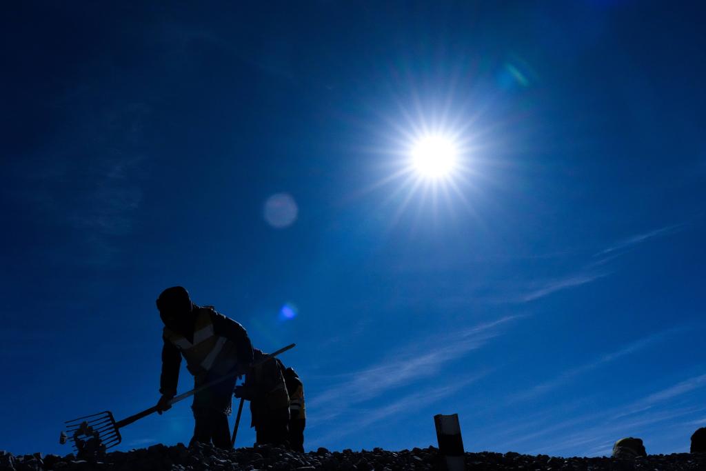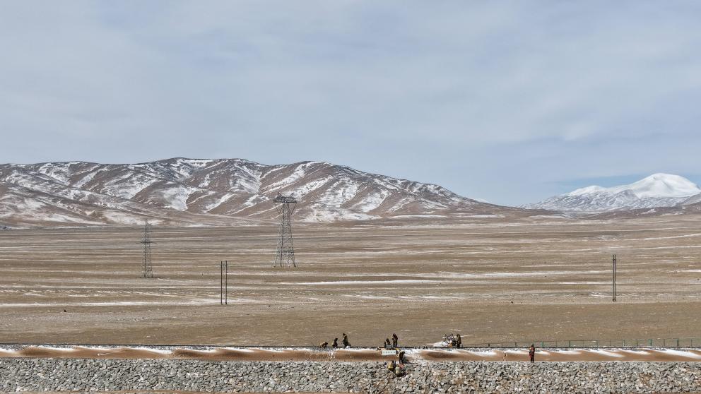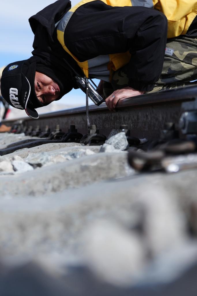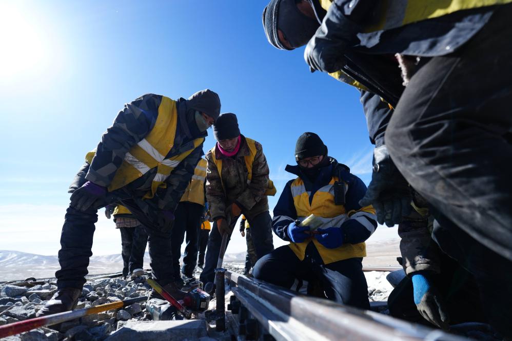 6日、青蔵鉄道の保守作業を行う中国鉄路青蔵集団格爾木(ゴルムド)保線区望崑路線作業所の保線作業員。(ゴルムド=新華社記者/斉芷玥)