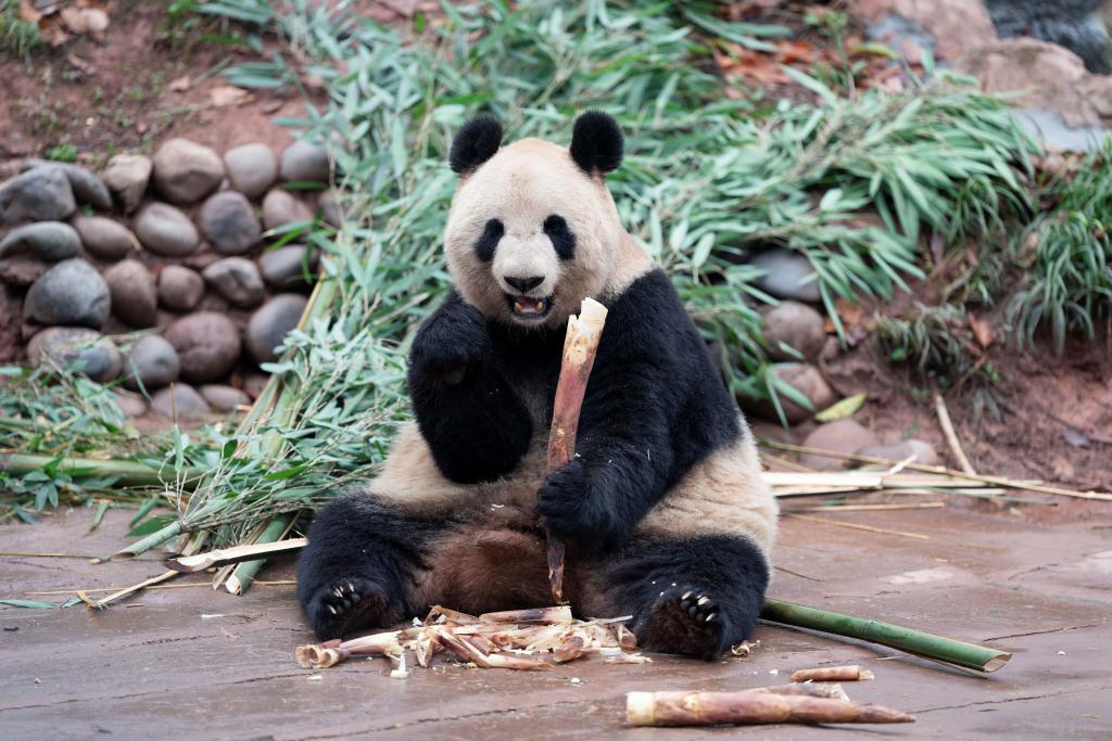 タケノコを手にご満悦のシンシン。(1月1日撮影、成都=新華社配信/Panda365提供)
