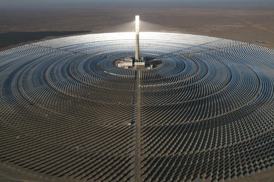 甘粛省酒泉市金塔マルチエネルギー相互補完拠点にある、10万キロワット溶融塩タワー式光熱発電プロジェクト。(2025年12月3日、ドローンから、酒泉=新華社記者/范培珅)