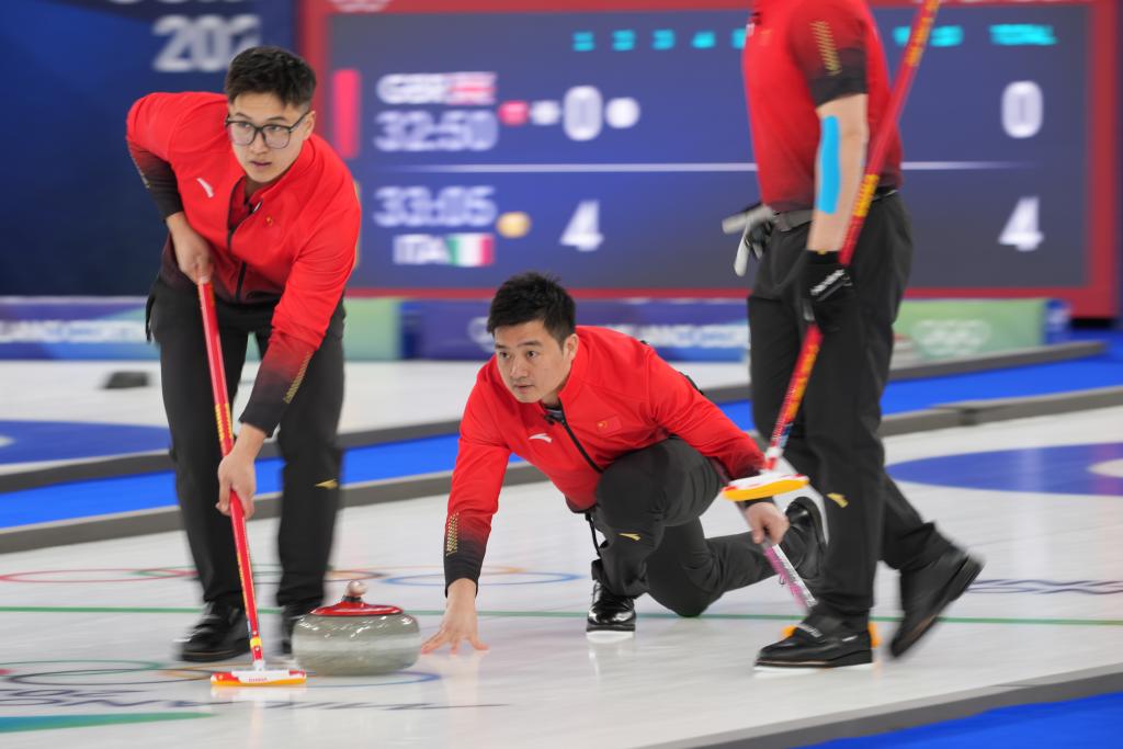 13日、カーリング男子1次リーグ、ノルウェー戦でショットを放つ中国の李智超(り・ちちょう、中央)。(コルティナダンペッツォ=新華社記者/李鋼)