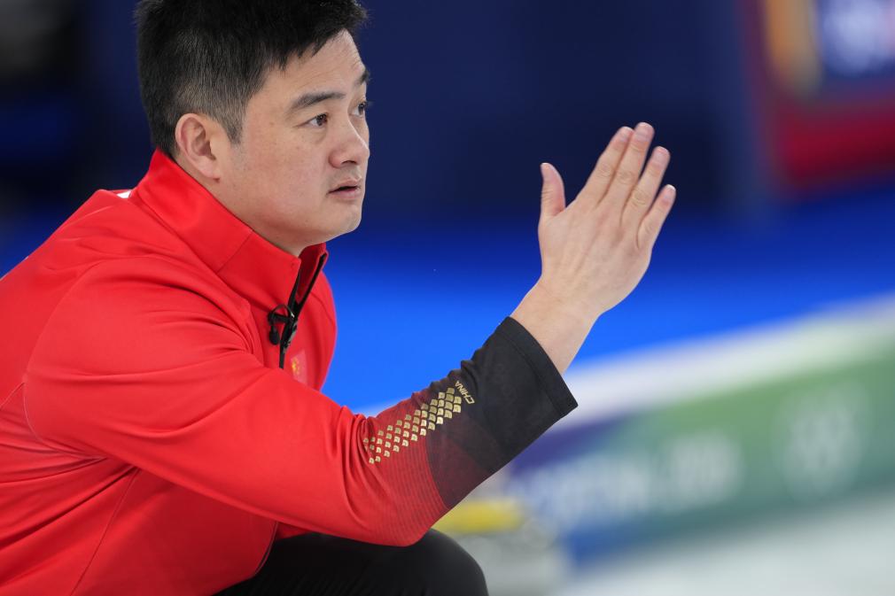 13日、カーリング男子1次リーグ、ノルウェー戦に臨む中国の徐暁明(じょ・ぎょうめい)。(コルティナダンペッツォ=新華社記者/李鋼)