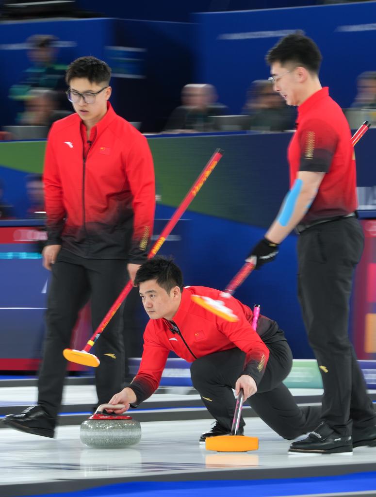 13日、カーリング男子1次リーグ、ノルウェー戦でショットを放つ中国の費学清(ひ・がくせい、中央)。(コルティナダンペッツォ=新華社記者/李鋼)