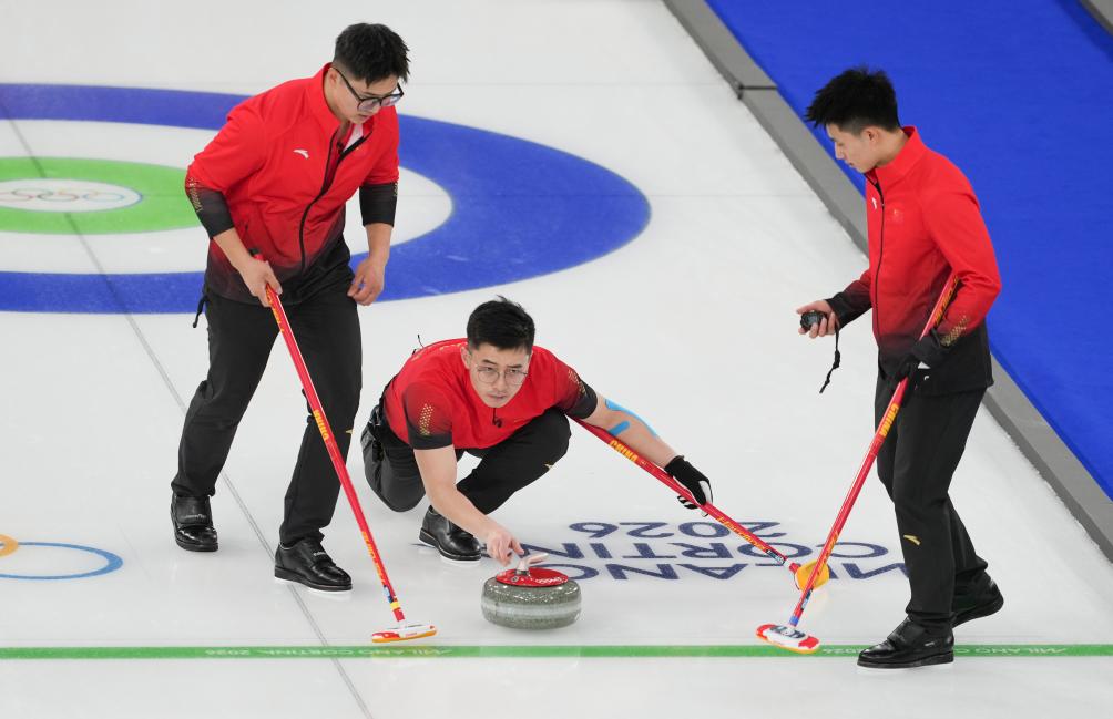 13日、カーリング男子1次リーグ、ノルウェー戦でショットを放つ中国の徐暁明(じょ・ぎょうめい、中央)。(コルティナダンペッツォ=新華社記者/李鋼)