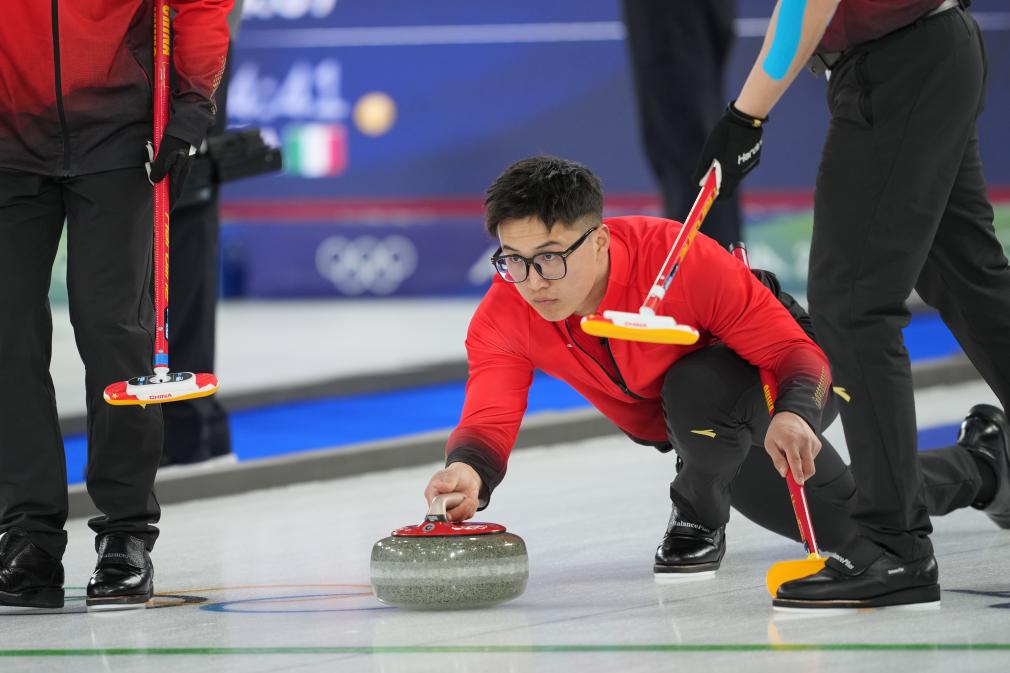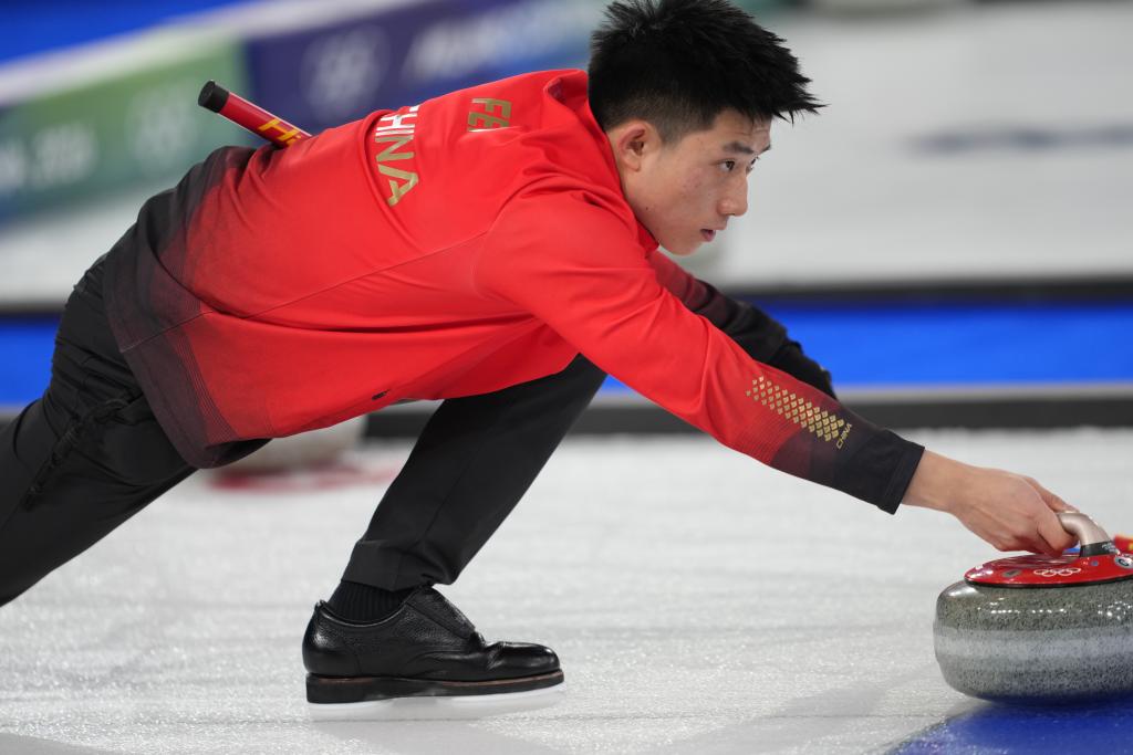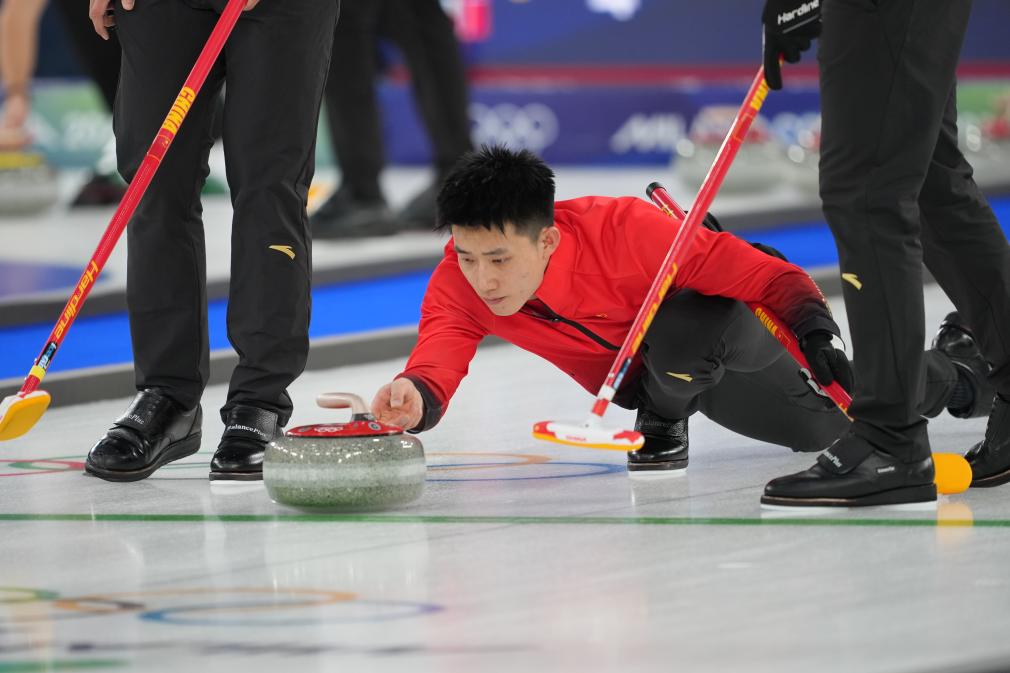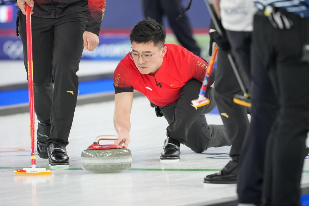 13日、カーリング男子1次リーグ、ノルウェー戦でショットを放つ中国の許静韜(きょ・せいとう)。(コルティナダンペッツォ=新華社記者/李鋼)