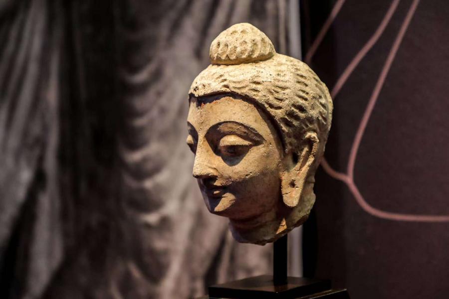 天津博物館「芳香妙相-南京大報恩寺遺跡博物館蔵ガンダーラ造像展」に展示された仏頭。(南京大報恩寺遺跡博物館蔵、天津=新華社配信)