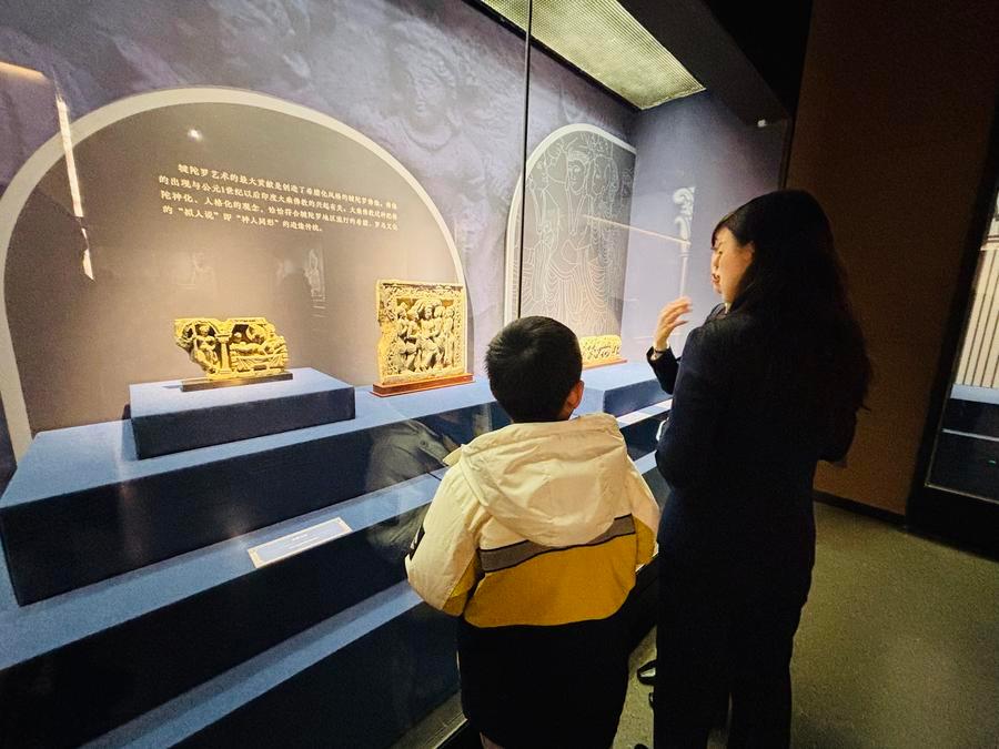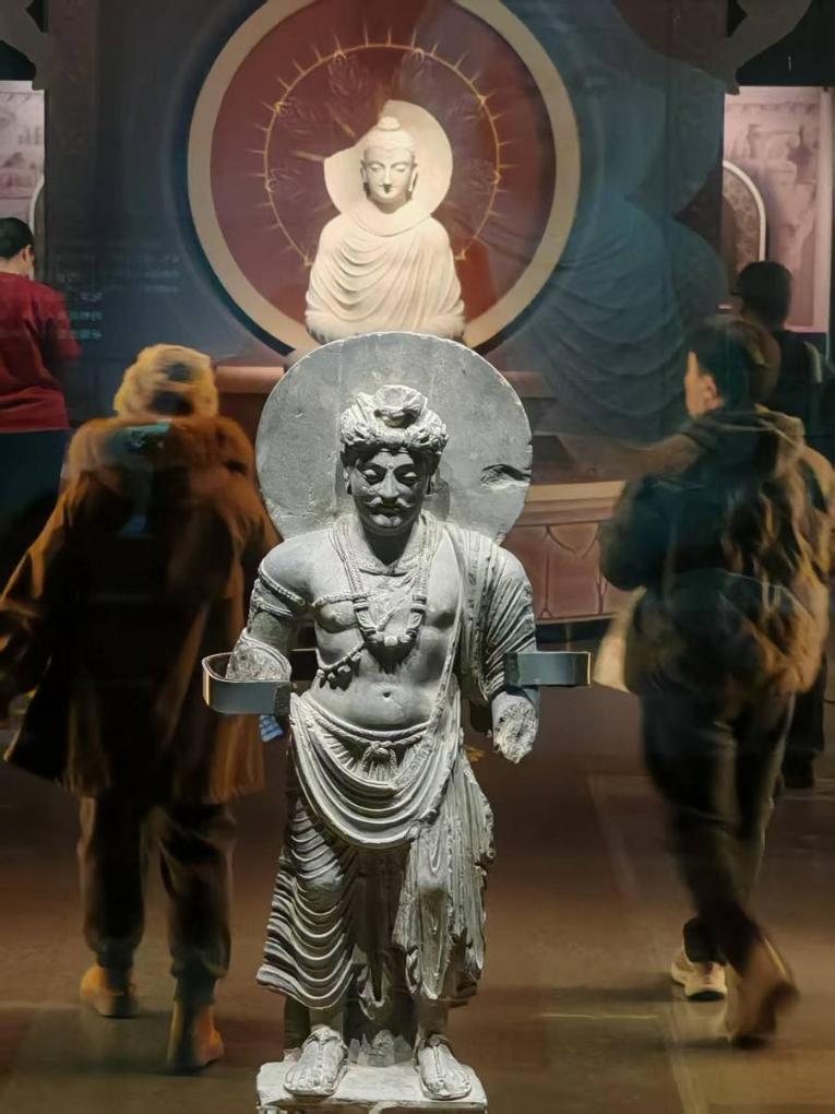 6日、天津博物館「芳香妙相-南京大報恩寺遺跡博物館蔵ガンダーラ造像展」で展示を見る人。(天津=新華社記者/周潤健)