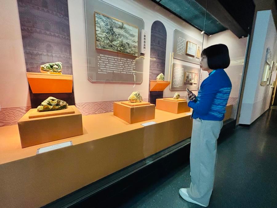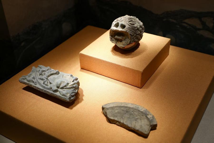 天津博物館「芳香妙相-南京大報恩寺遺跡博物館蔵ガンダーラ造像展」に展示された南京大報恩寺の建築部材(明代、南京大報恩寺遺跡博物館蔵)。 (天津=新華社配信)