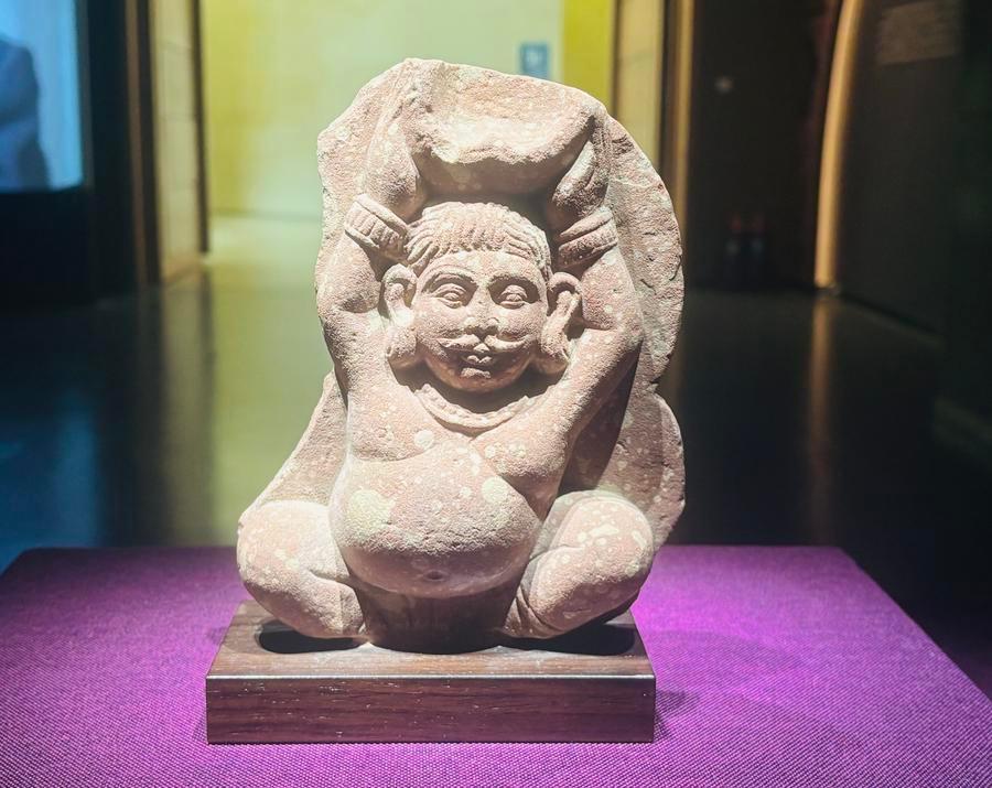 6日、天津博物館「芳香妙相-南京大報恩寺遺跡博物館蔵ガンダーラ造像展」に展示された夜叉像。(南京大報恩寺遺跡博物館蔵、天津=新華社記者/周潤健)